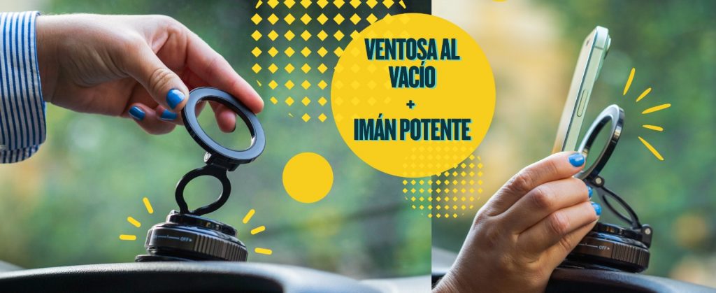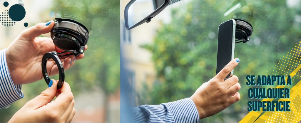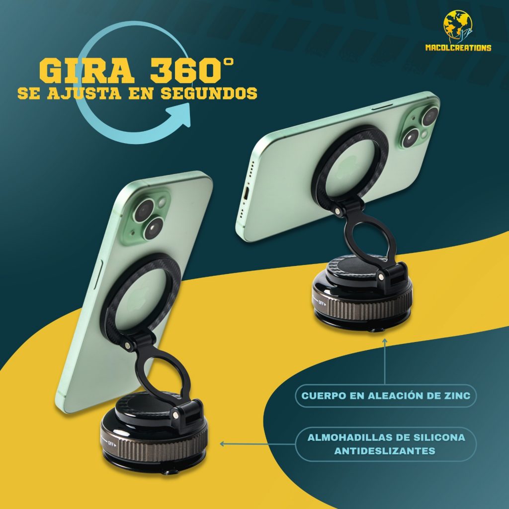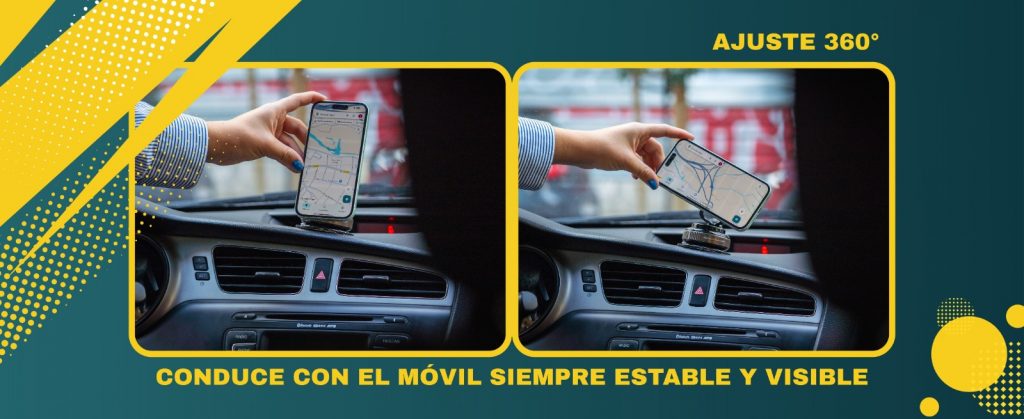 - Súper sujeción de vacío + imán: nuestro soporte movil coche tiene una base de alta elasticidad y ventosa de vacío que fija el soporte incluso en superficies texturizadas; el imán del suporte telemovel carro mantiene el móvil firme en baches y frenadas.